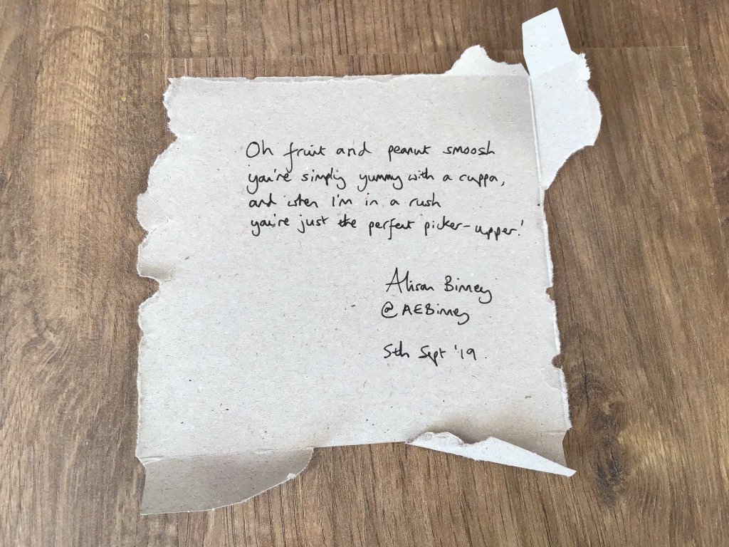 Helena Nelson at Happenstance Press recently launched the International Wrapper-Rhyme Challenge. The idea is simple: write a rhyming poem about a food or beverage on the wrapper itself. All the entries are to be exhibited at StAnza, Scotland’s poetry festival, in 2020. It’s great to find a poetry competition that doesn’t take itself too seriously, and I really enjoyed the playfulness of writing on a box of my favourite peanut Nakd bars. I found it really made me read the wording on the packaging carefully as I used it for inspiration for my poem. I’ll look forward to seeing the final exhibition next year. (Closing date for entries, if you’re interested, is 25th December 2019.)