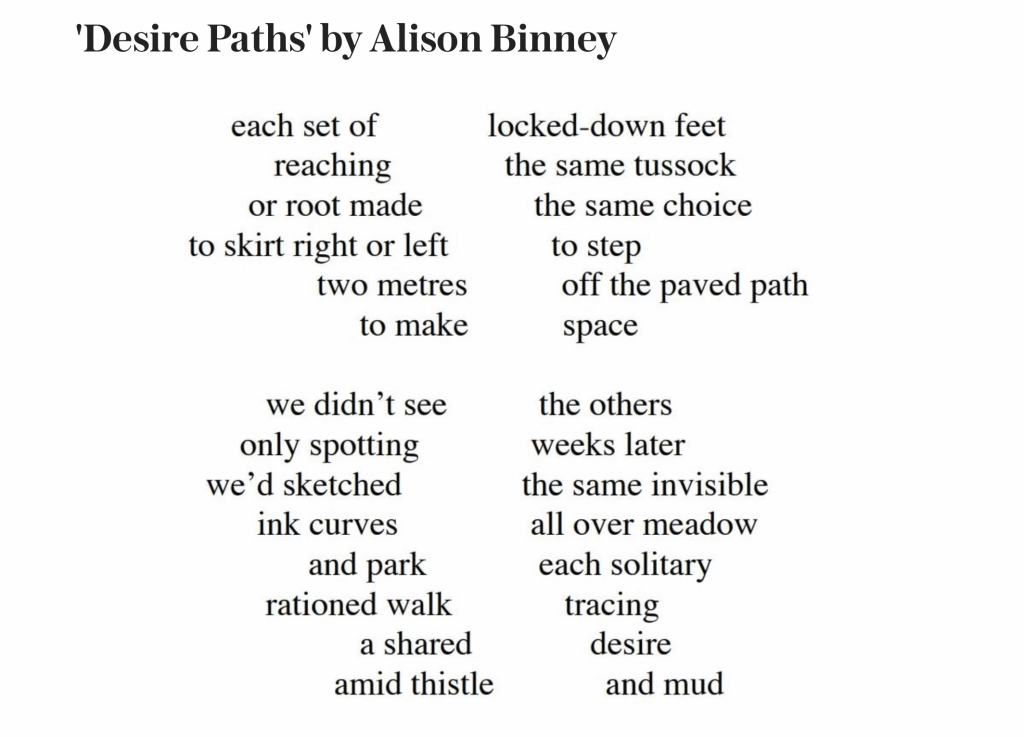 My poem ‘Desire paths’ emerged in late June as a result of reading Amelia Tait’s article and then following the desire paths to get a feel for how they took the routes they now so clearly traced, without any conscious planning. I recently entered it into the Daily Telegraph lockdown poetry competition, and was delighted to be selected as one of the four runners-up. The Telegraph article is, unfortunately, behind a paywall, but here’s a screenshot of the poem: