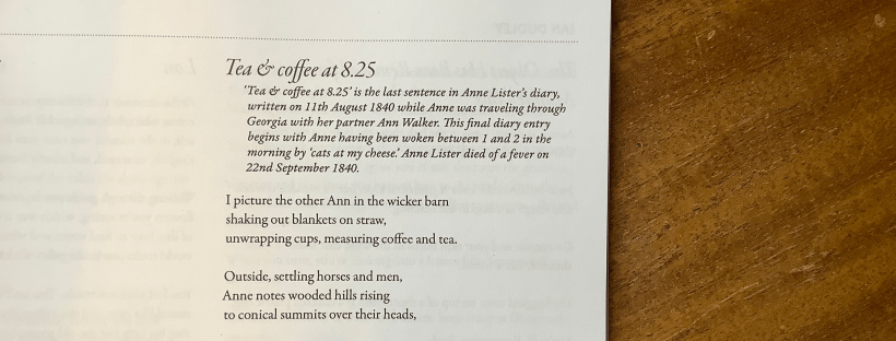 One particular challenge in writing this poem is that Anne’s partner’s name was also Ann. This is a particular issue for some same-sex couples, and I’ve discovered that there’s a rather satisfying name for it: homonymy. Nevertheless, it makes life tricky for a poet who wants readers not to be confused. At least Anne and Ann’s names are spelled slightly differently, so I refer to ‘the other Ann’ in the first verse, and hope that the reader will recognise the shift to Anne (with an ‘e) Lister in the second. Of course, it’s harder for an audience to spot that difference when the poem is read aloud!