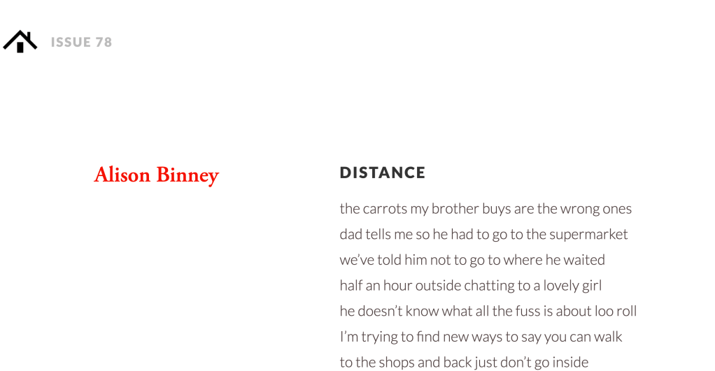 You can read my poem, ‘Distance’, here, but do have a browse of all the other poems in Issue 78 too.